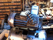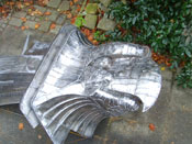 v.o.n.u.: New York Below, einer der Adlerköpfe des Chrysler Buildings fungiert als Untergangsszenario, indem er aus Schutt heraus ragt. Siehe auch großes Bild links; 2 Bilder: Auftragsarbeit für Fa. Ekom Air Ahrensburg, Kompressor-Skulptur zum 25-jährigen Jubiläum, während der Produktion und im Foyer des Hauptsitzes in Tschechien. |