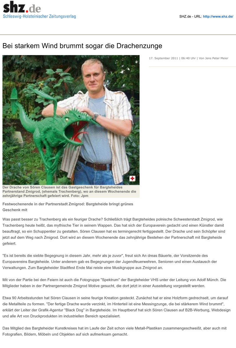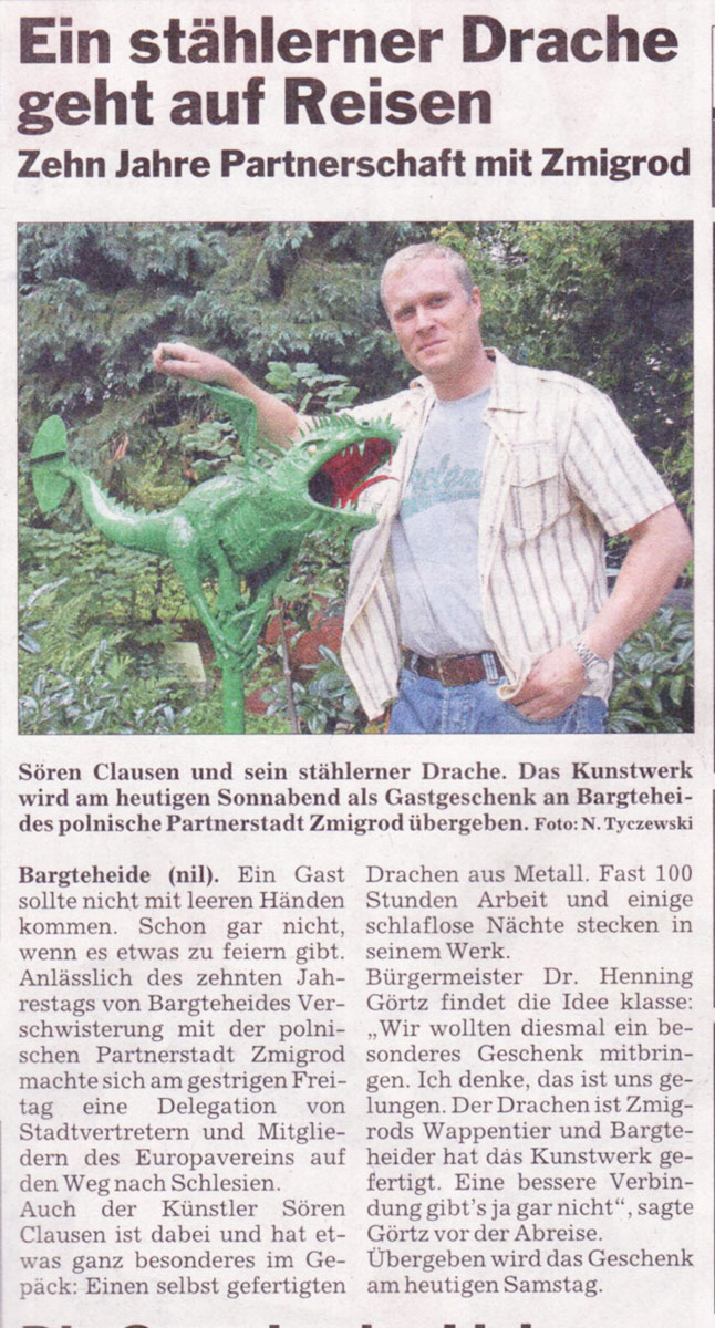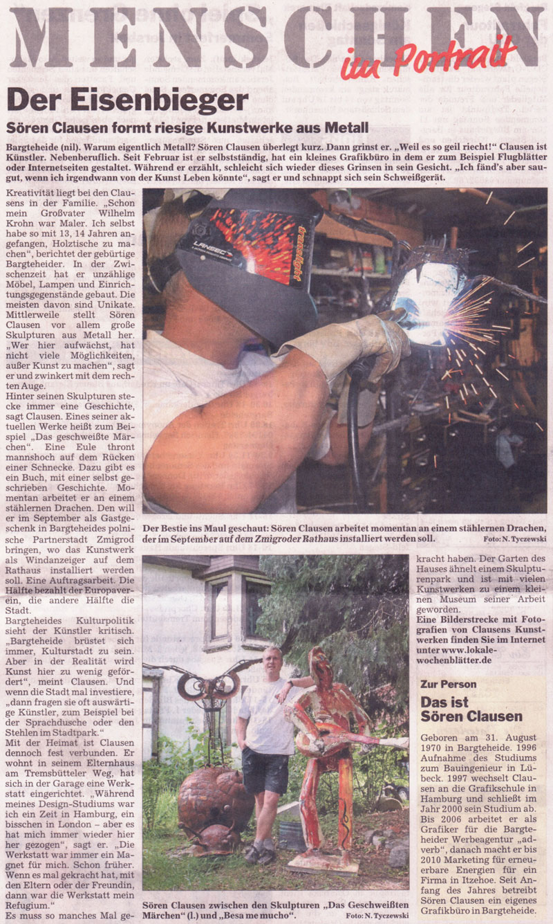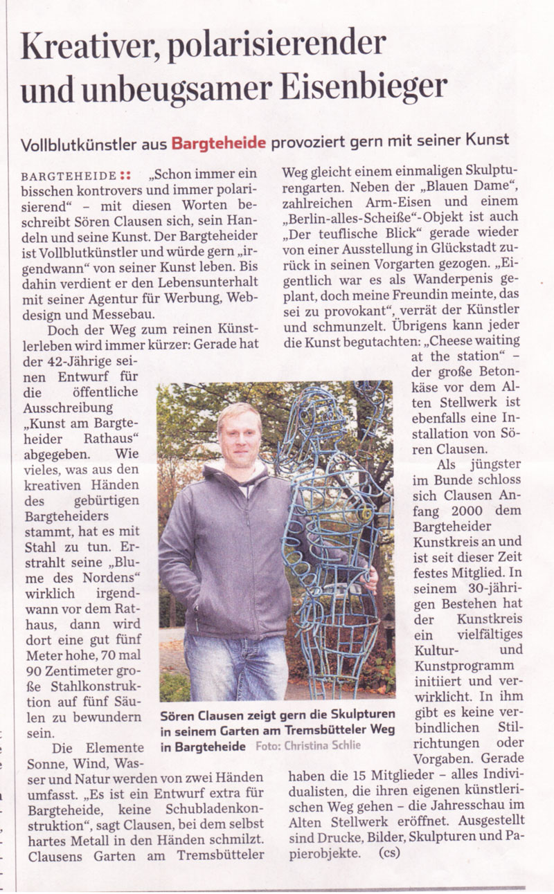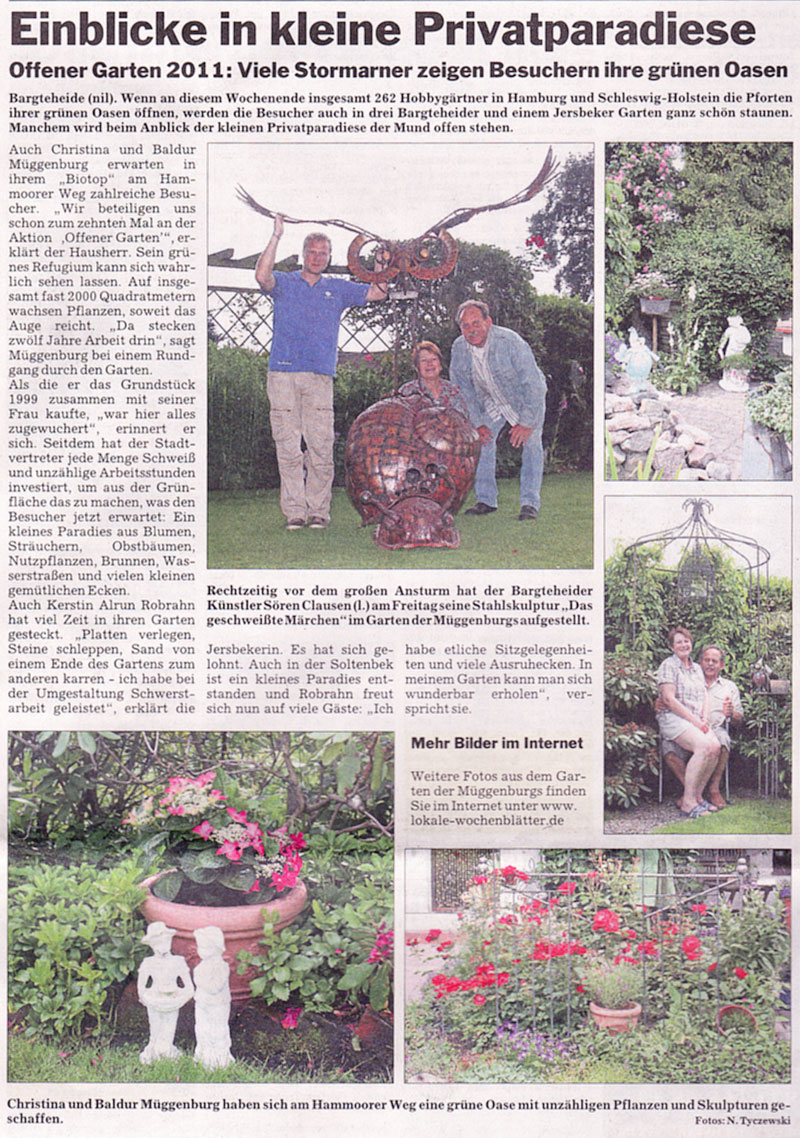 Artikel im Zuge der "Offenen Gärten" in Schleswig Holstein. Skulptur "Ein geschweisstes Märchen" war an Familie Müggenburg ausgeliehen. |