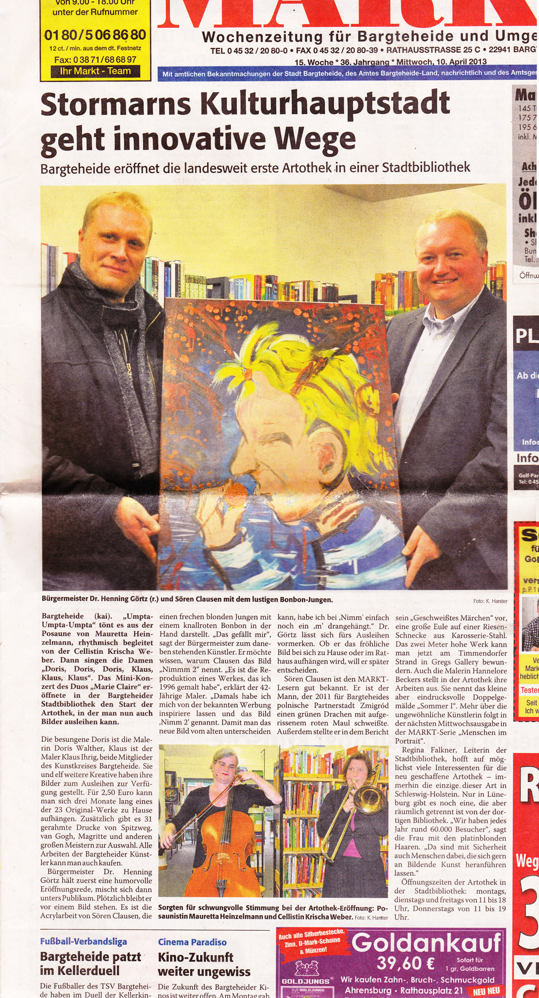 Titelseite! Artikel über die Eröffnung der "Artothek" in der Bargteheider Stadtbibliothek. |
