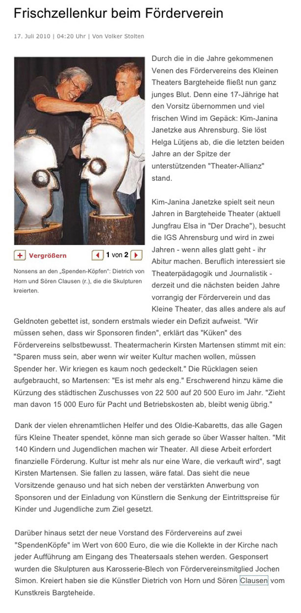 Artikel im Zuge der Kreation zweier "Kulturköpfe"als Spendendosen für das Kleine Theater Bargteheide • Seht euch auch die Fotostrecke an. |