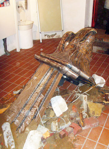 | v.o.n.u.: New York Below, einer der Adlerköpfe des Chrysler Buildings fungiert als Untergangsszenario, indem er aus Schutt heraus ragt. Siehe auch großes Bild links; 2 Bilder: Auftragsarbeit für Fa. Ekom Air Ahrensburg, Kompressor-Skulptur zum 25-jährigen Jubiläum, während der Produktion und im Foyer des Hauptsitzes in Tschechien. |